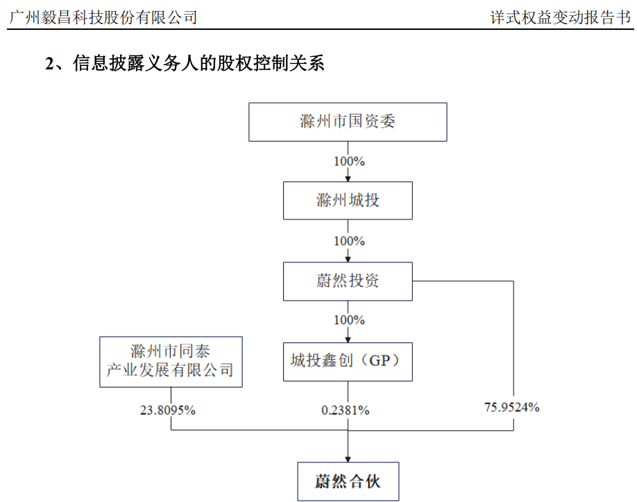 12月25日晚间,毅昌科技发布公告称,公司控股股东将变为滁州蔚然科技发展合伙企业(有限合伙)(以下简称蔚然合伙),实控人将变为滁州市人民政府国有资产监督管理委员会(以下简称滁州市国资委)。