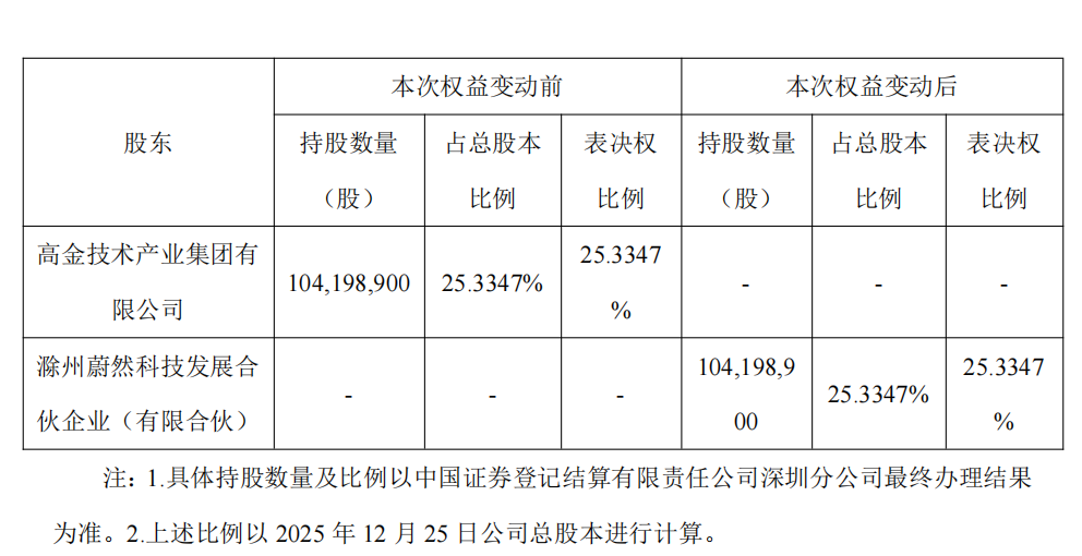 12月25日,毅昌科技接到其控股股东高金技术产业集团有限公司(以下简称高金集团)的通知,获悉高金集团与蔚然合伙已经签署《股份转让协议》。