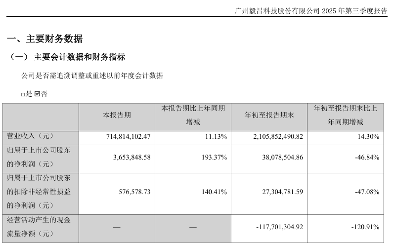 2025年前三季度期货杠杆交易平台,毅昌科技的归母净利润为3807.85万元,同比下降46.84%;扣非后净利润为2730.48万元,同比下降47.08%。