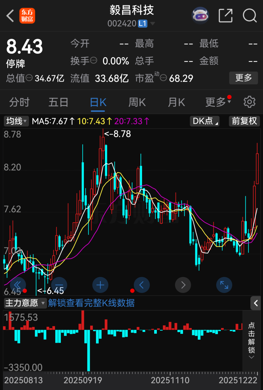 毅昌科技自12月23日开市起停牌,计划自12月26日开市起复牌。截至12月22日收盘,毅昌科技股价报8.43元/股,涨幅达5.64%,总市值为34.67亿元。