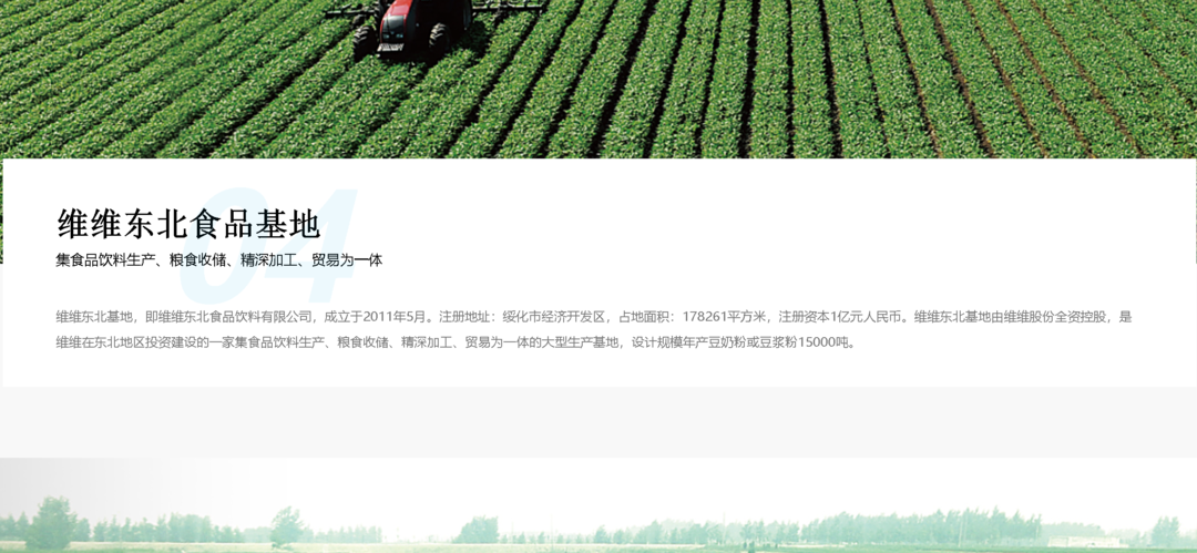 维维东北食品饮料有限公司,成立于2011年5月。由维维股份全资控股,是维维在东北地区投资建设的一家集食品饮料生产、粮食收储、精深加工、贸易为一体的大型生产基地,设计规模年产豆奶粉或豆浆粉15000吨。